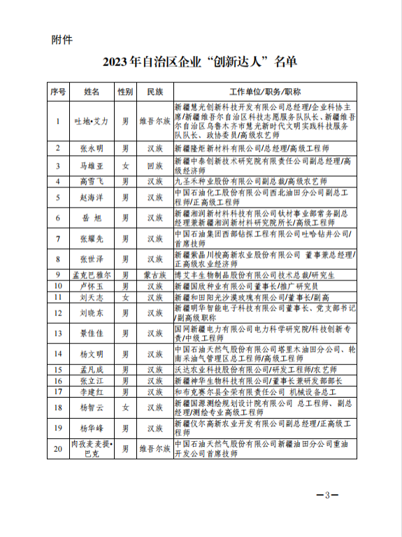 根據(jù)中國科協(xié)企創(chuàng)中心關(guān)于開展企業(yè)“創(chuàng)新達(dá)人”評選工作的有關(guān)安排,自治區(qū)科協(xié)聯(lián)合自治區(qū)國資委、工商聯(lián)于2023年5月22日印發(fā)《關(guān)于組織開展2023年自治區(qū)企業(yè)“創(chuàng)新達(dá)人”宣講活動(dòng)的通知》,通過3個(gè)多月的廣泛動(dòng)員、逐級推薦、資格審查、線上投票、專家評審、網(wǎng)站公示等評選環(huán)節(jié),最終評選出20名企業(yè)家、科研能手、技能工匠為2023年自治區(qū)企業(yè)“創(chuàng)新達(dá)人”。