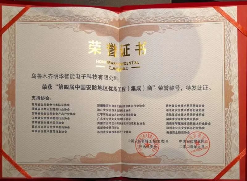 2020年9月16日,由中國安防展覽網(wǎng)主辦,青海省公共安全技術(shù)防范協(xié)會協(xié)辦,全國各省市安防協(xié)會支持的中國安防行業(yè)頒獎盛典暨第三屆中國安防大數(shù)據(jù)發(fā)展高峰論壇在青海省西寧市盛大召開。經(jīng)過各省市安防協(xié)會初審和行業(yè)專家終審,烏魯木齊明華智能電子科技有限公司榮獲“第四屆中國安防百強(qiáng)工程(集成)商”榮譽(yù)。