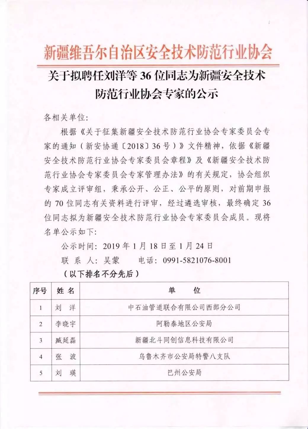 2019年1月18日,新疆安全技術(shù)防范行業(yè)協(xié)會(huì)(以下簡(jiǎn)稱新疆安防協(xié)會(huì))發(fā)布了《關(guān)于擬聘任劉洋等36位同志為新疆安全技術(shù)防范行業(yè)協(xié)會(huì)專家的公示》,明華科技總經(jīng)理劉曉東榮幸成為專家委員會(huì)成員。