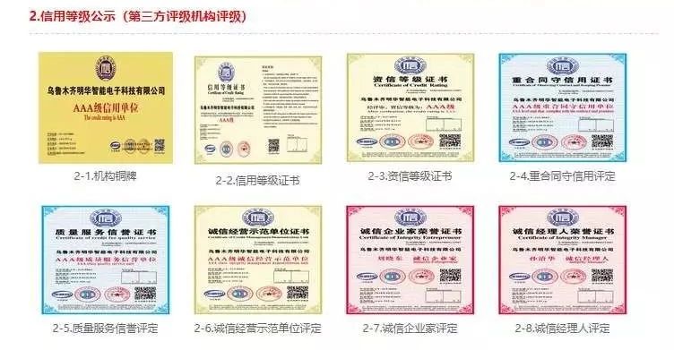 2018年9月27日,烏魯木齊明華智能電子科技有限公司順利通過(guò)了國(guó)家企業(yè)信用AAA級(jí)等級(jí)評(píng)定,其中包含企業(yè)信用AAA級(jí)等級(jí)證書(shū)、資信等級(jí)AAA級(jí)證明、AAA級(jí)重合同守信用證書(shū)、AAA級(jí)質(zhì)量服務(wù)信譽(yù)證書(shū)、AAA級(jí)誠(chéng)信經(jīng)營(yíng)示范單位,同時(shí)董事長(zhǎng)劉曉東、副總經(jīng)理孫治華也分別獲得誠(chéng)信企業(yè)家證書(shū)及誠(chéng)信經(jīng)理人證書(shū)。